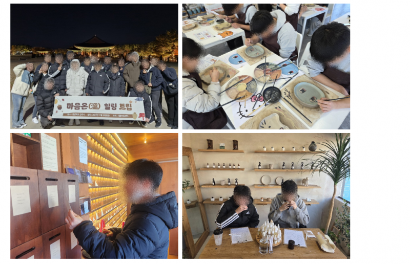 치유 여가프로그램 "마음온 힐링트립"(2025.11.28) 페이지 정보 작성자 최고관리자 작성일25-12-31 15:22 조회58회 관련링크 이전글 다음글 목록 본문 2025.11.28(금) "마음온 힐링트립" 이번 프로그램은 경주 일대를 방문하여 도자기 만들기 체험과 향수 만들기(향기테라피) 활동으로 구성되었습니다. 또한 경주의 정취가 가득한 황리단길을 산책하며 여유로운 시간을 보내고, ‘시간을 건너 온 편지’ 활동을 통해 아이들이 직접 고른 엽서에 자신의 마음을 담아 편지를 써보았습니다.하루의 마무리는 동궁과 월지의 아름다운 야경을 감상하며, 일상에서 벗어나 마음의 온기를 채우는 시간을 가졌습니다. 이전글 다음글 목록